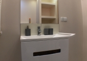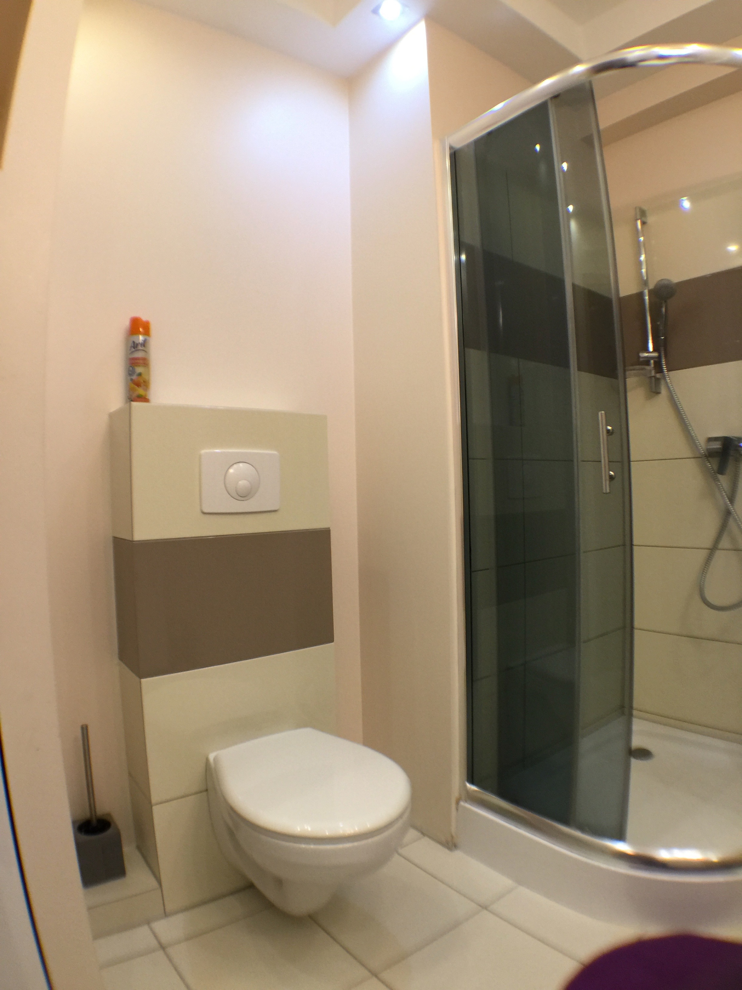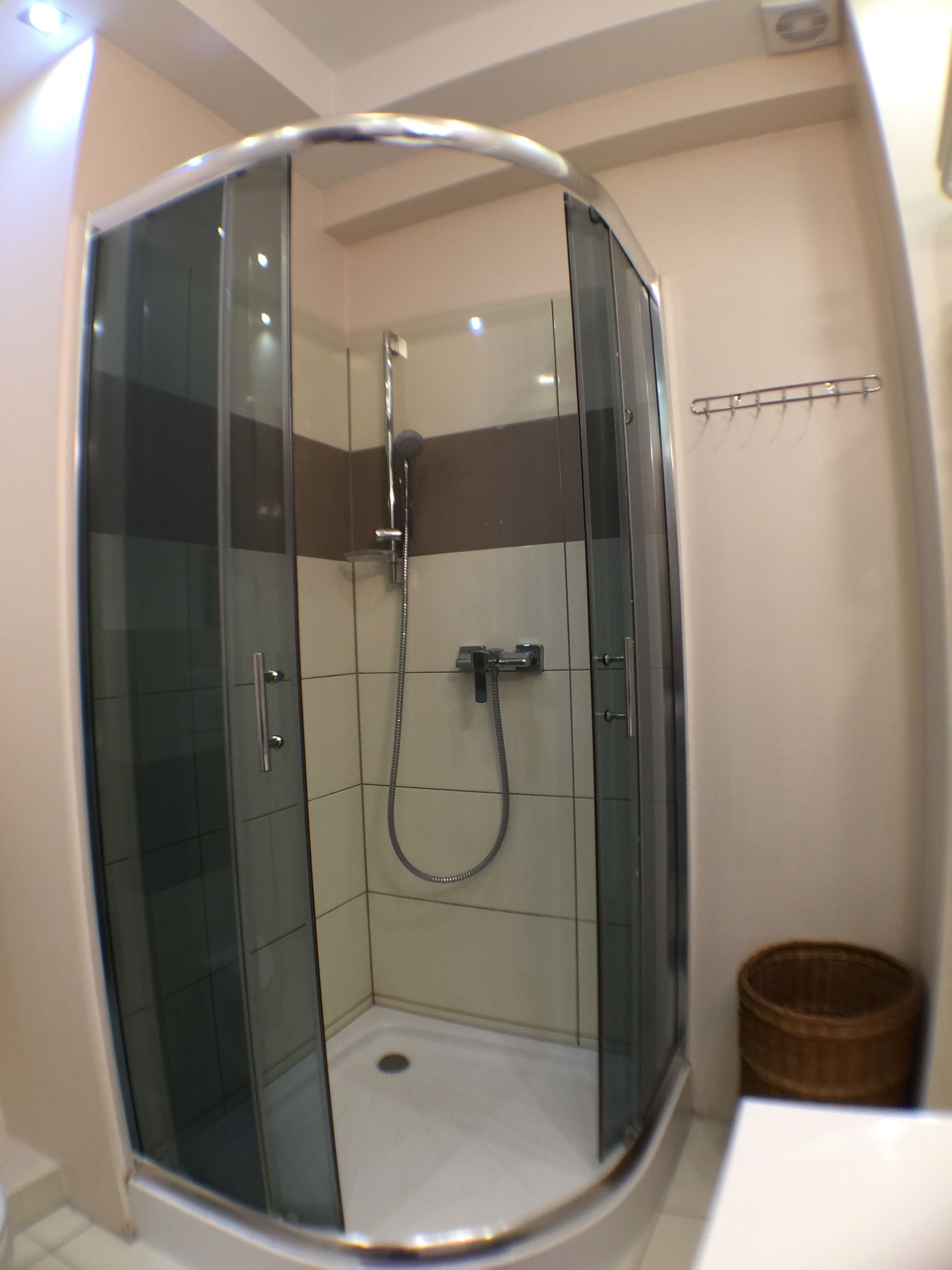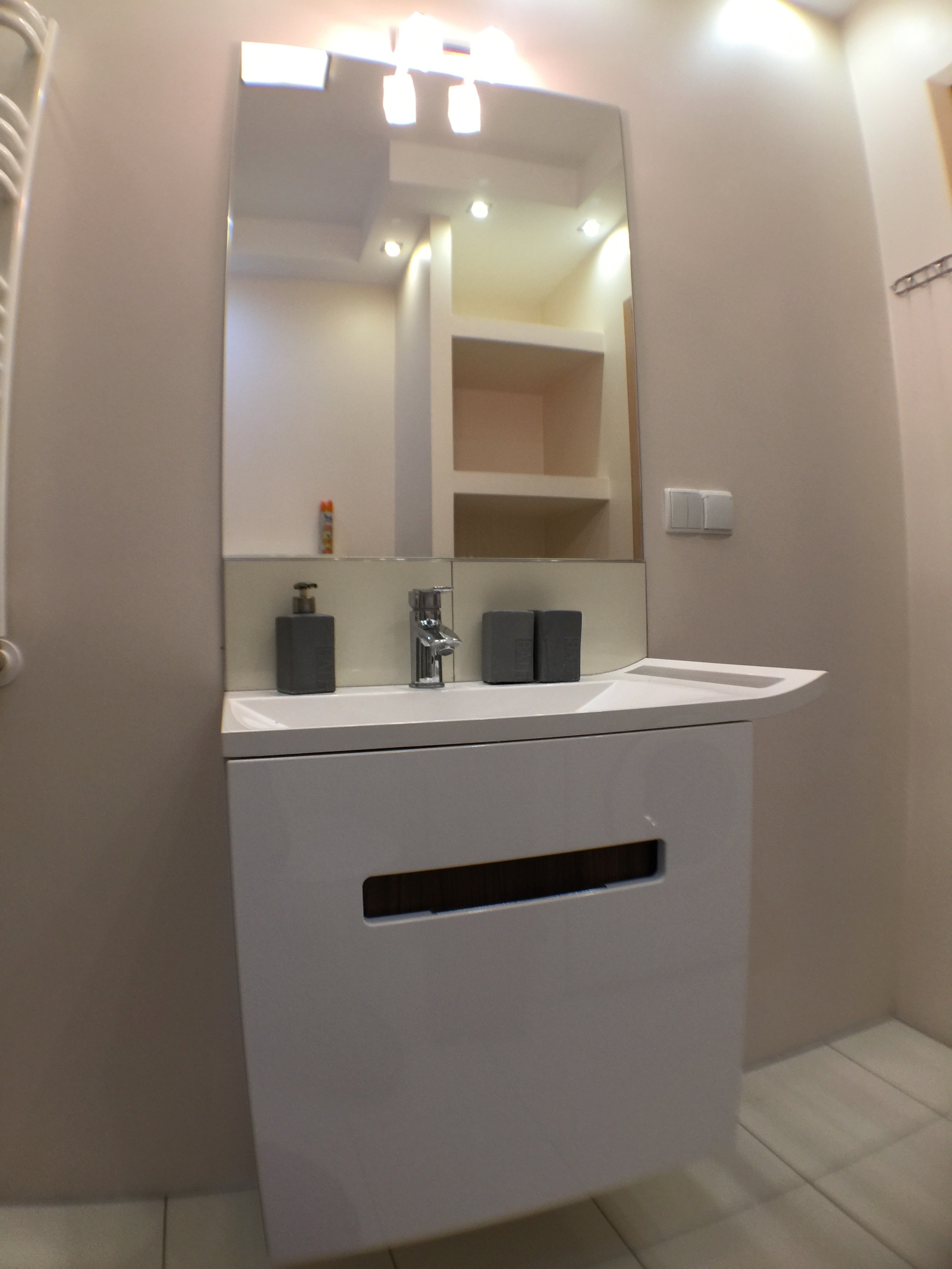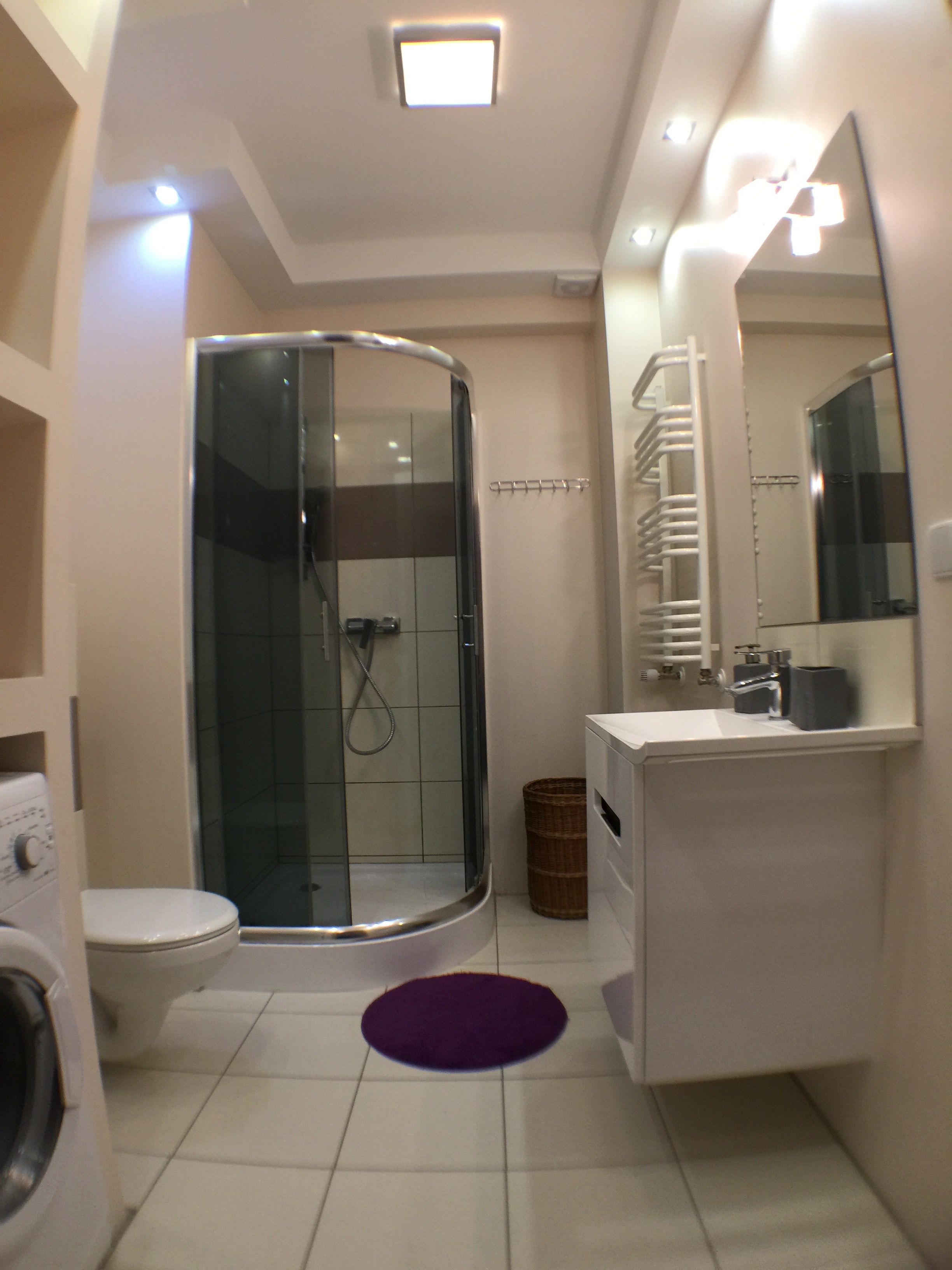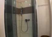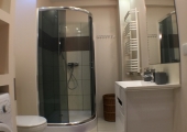 Łazienka jest duża z kabiną prysznicową, umywalką, lustrem oraz WC.