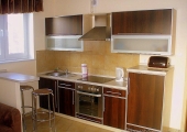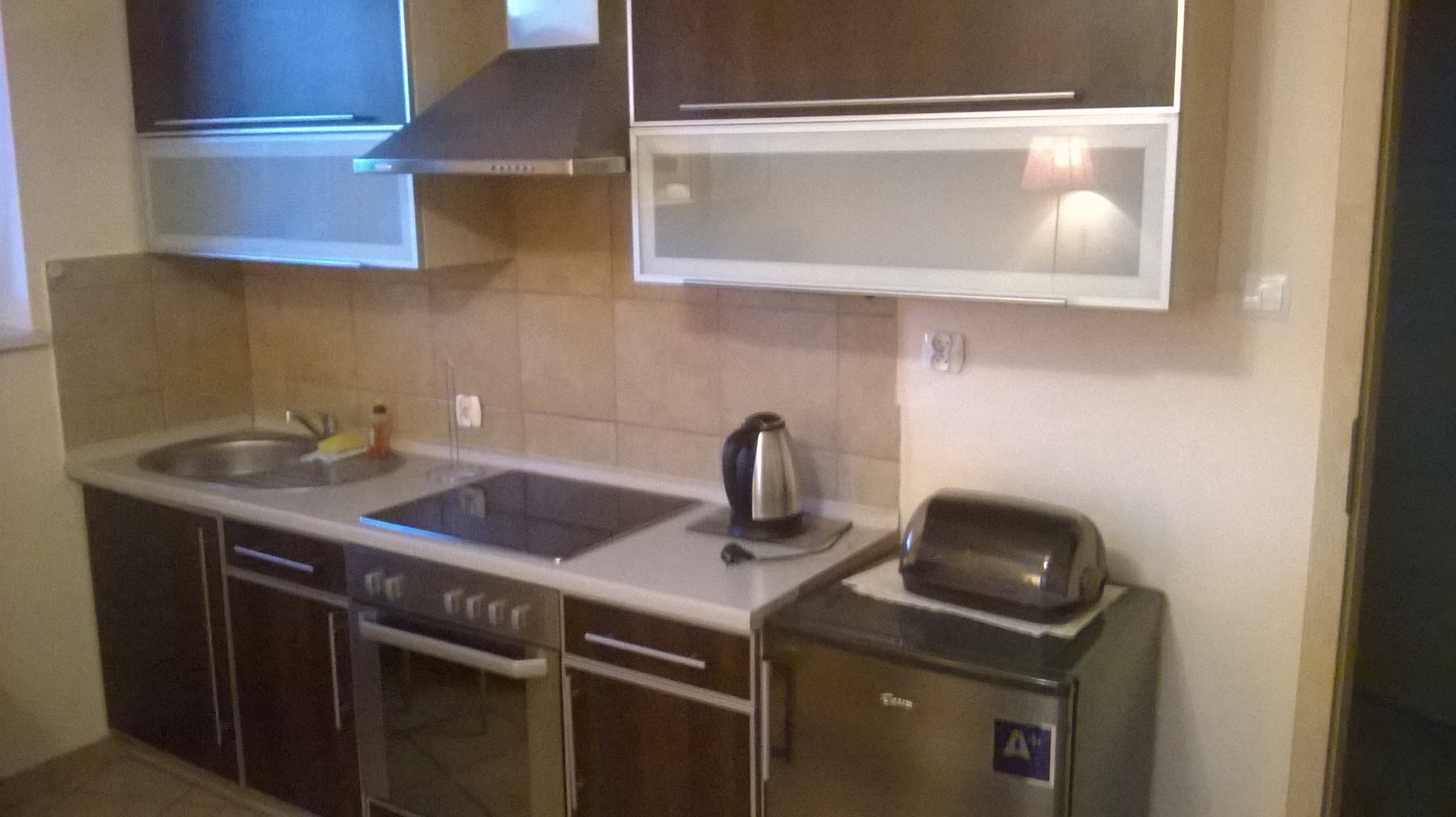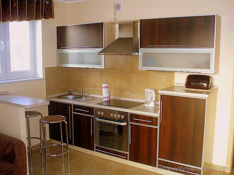 Pokój dzienny jest połączony z aneksem kuchennym w pełni wyposażonym. W skład jego wchodzą: kuchenka z płytą ceramiczną i piekarnikiem, lodówka, czajnik elektryczny, komplet garnków, zastawa stołowa oraz sztućce.