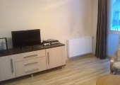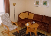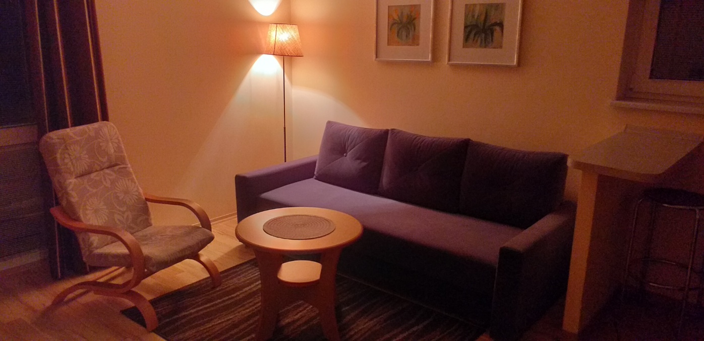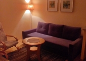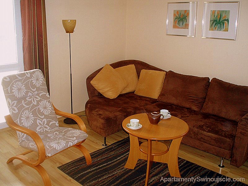 Składa się ze słonecznego salonu od strony południowej, z którego jest bezpośrednie wyjście na balkon. W salonie znajduje się duża nowoczesna sofa z funkcją spania, szeroka komoda, odbiornik TV, odtwarzacz DVD wraz z kolekcją paru płyt oraz stolik.