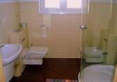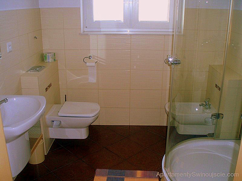 Łazienka jest duża, jasna i komfortowa z kabiną prysznicową, umywalką z lustrem, bidetem oraz WC.