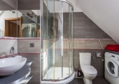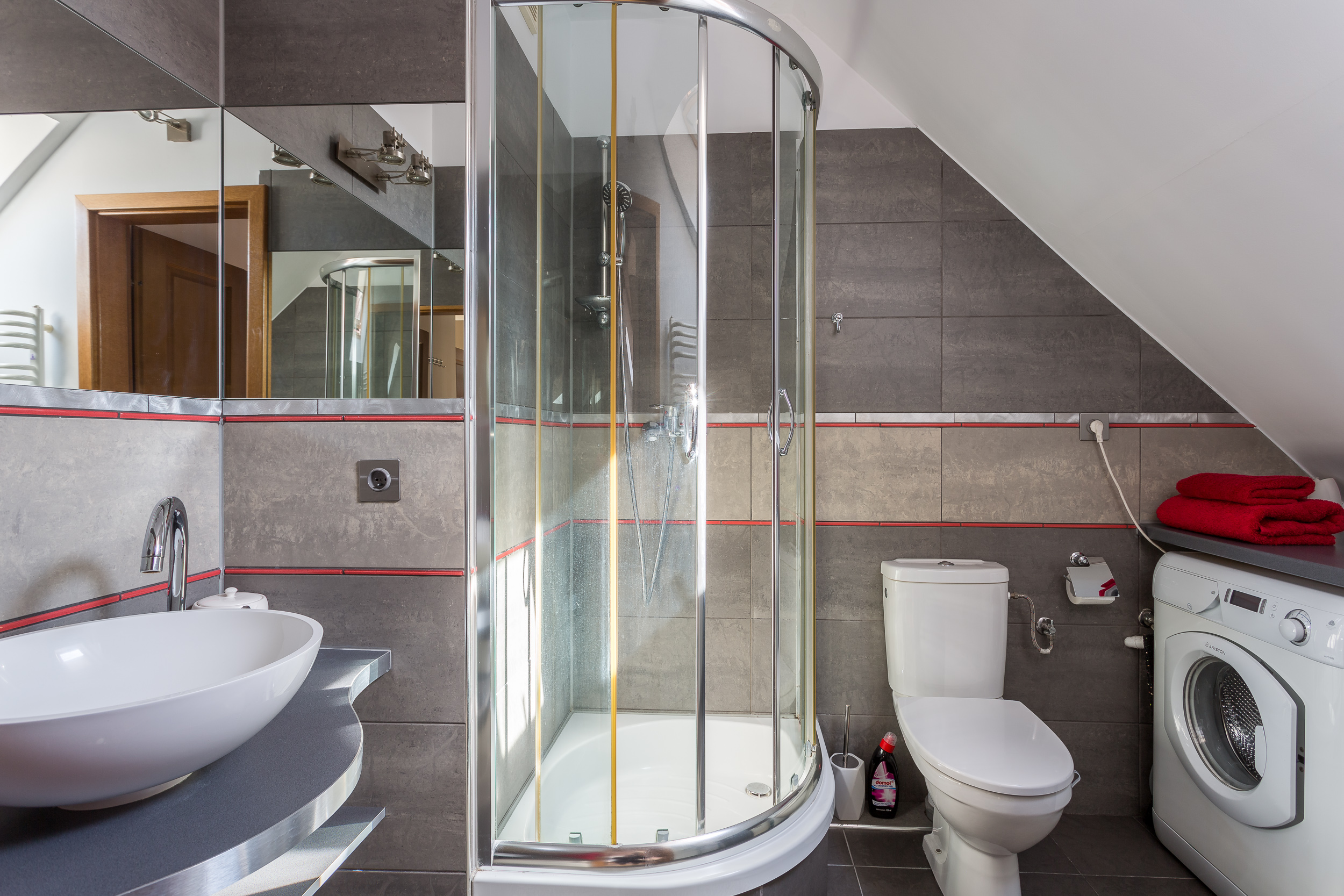 Na tym poziomie mamy także łazienkę z prysznicem, toaletą oraz pralką.