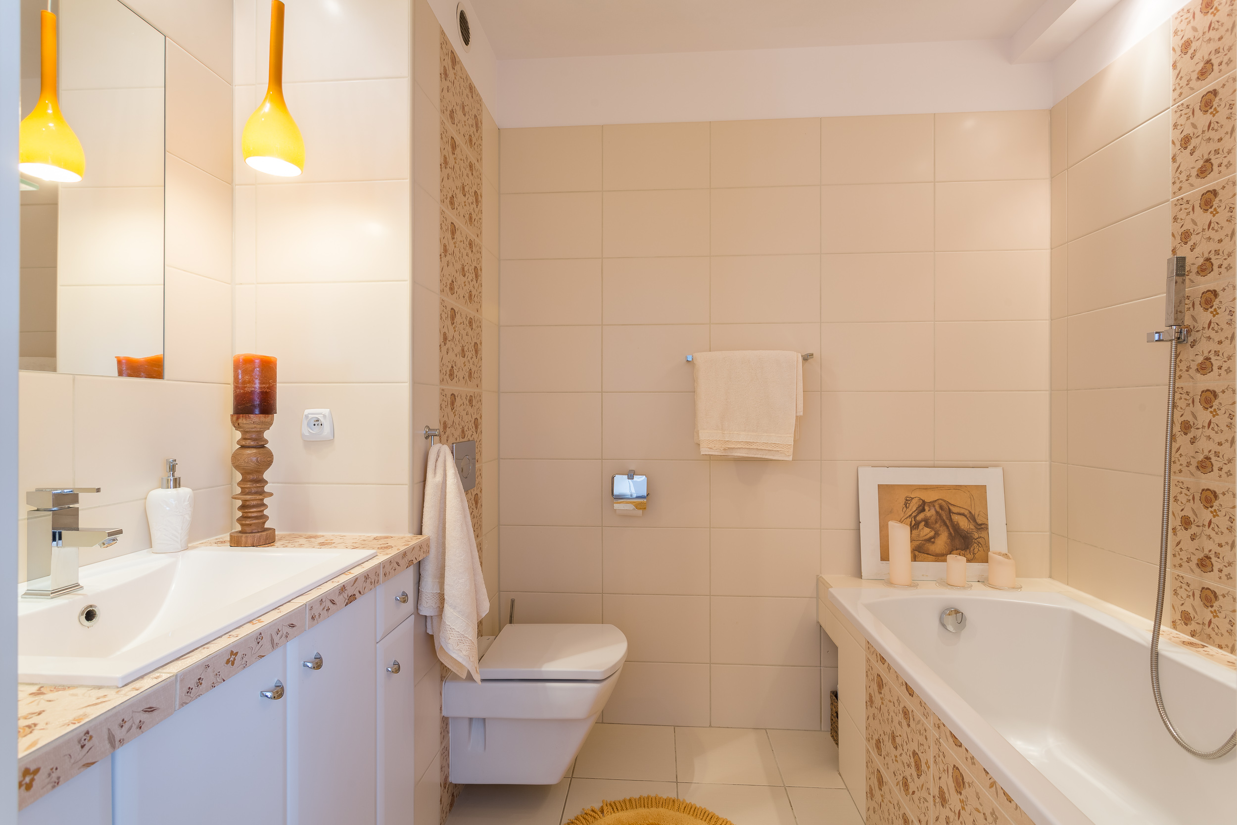 Łazienka na pierwszym poziomie jest duża z wanną, umywalką, lustrem oraz WC.