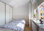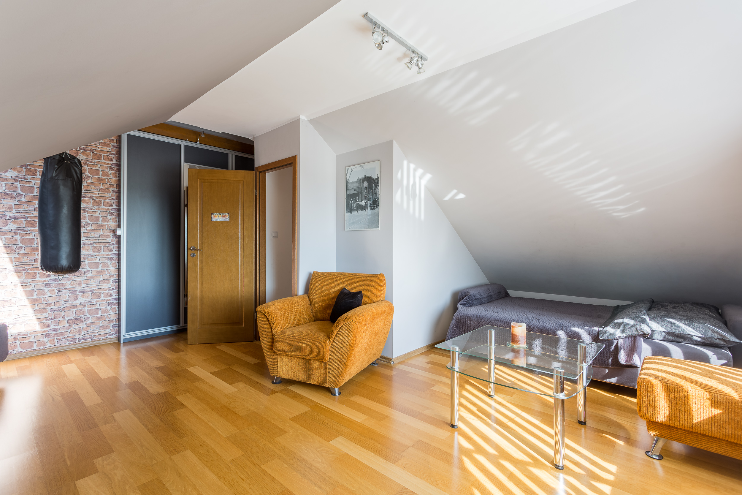 Na drugim poziomie apartamentu mamy przestronny pokój z rozkładaną sobą z funkcją spania dla dwóch osób. Duża zabudowana szafa, telewizor, fotel, szklany stolik.